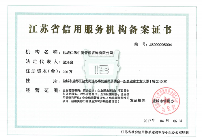 - 江蘇省信用服務(wù)機(jī)構(gòu)備案證書(shū)